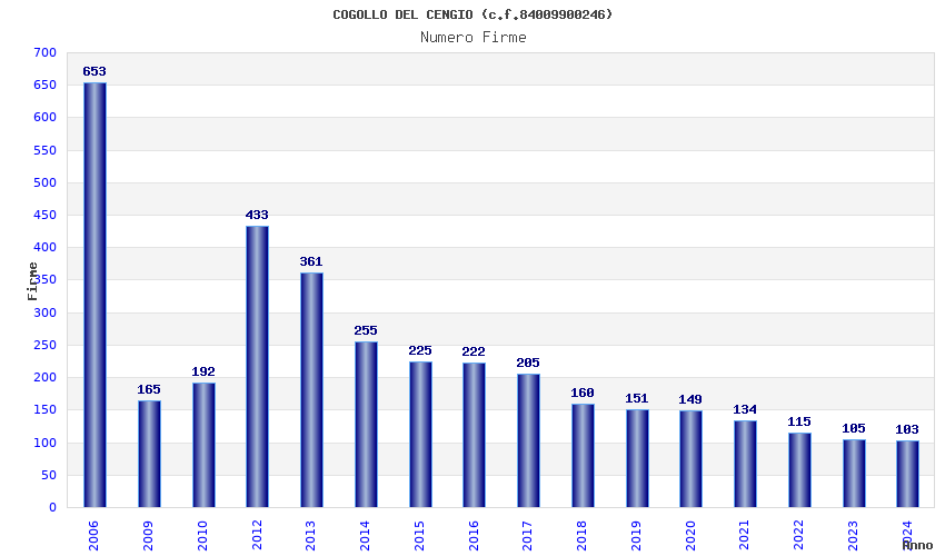 | Anno | Firme | Importi | Media | Naz. | Reg. | Prov. | Comu. |
