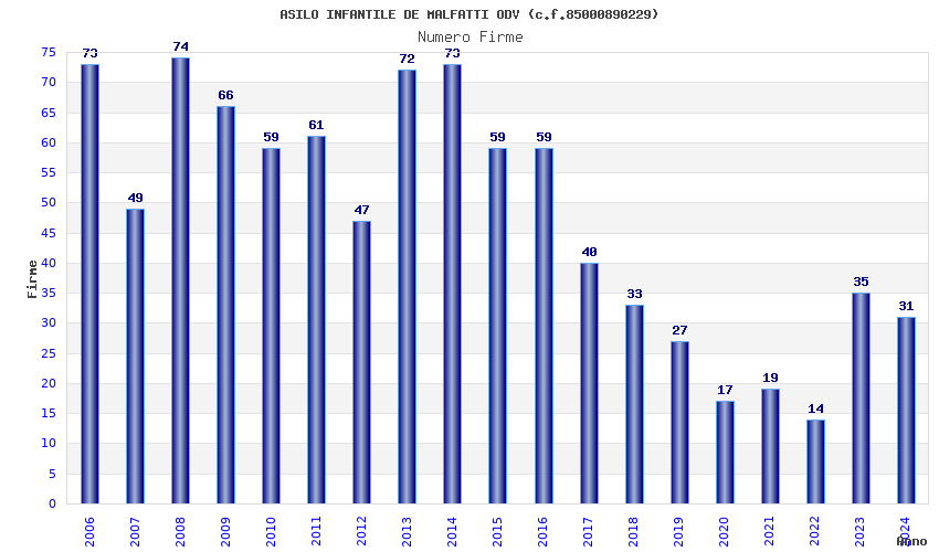 | Anno | Firme | Importi | Media | Naz. | Reg. | Prov. | Comu. |