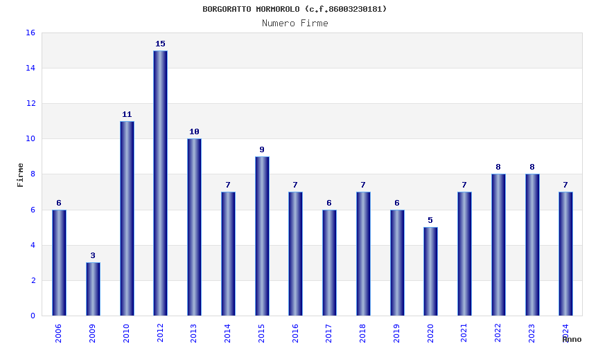 | Anno | Firme | Importi | Media | Naz. | Reg. | Prov. | Comu. |