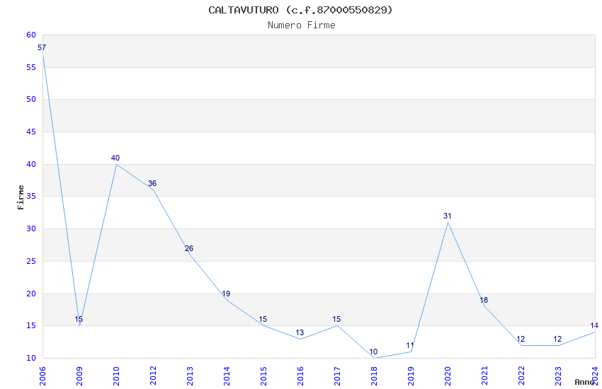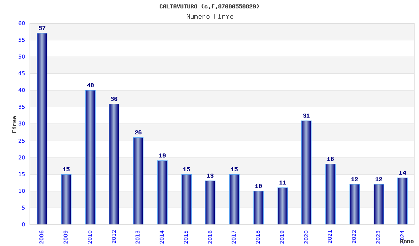 | Anno | Firme | Importi | Media | Naz. | Reg. | Prov. | Comu. |