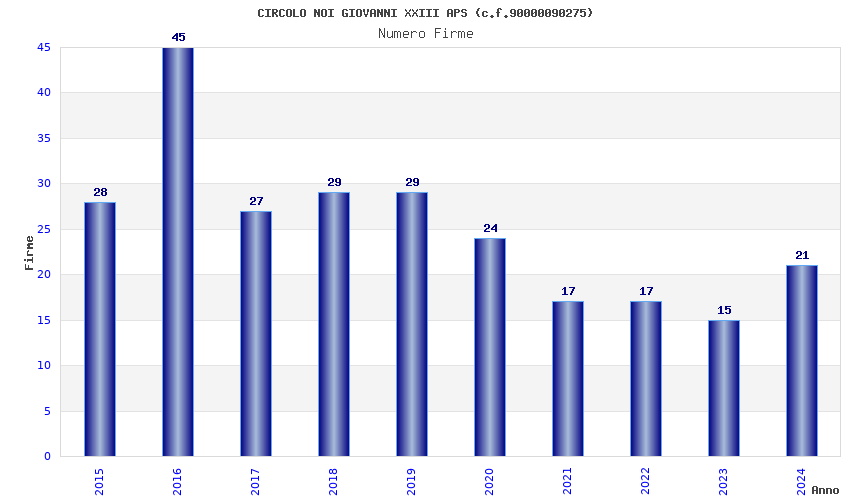 | Anno | Firme | Importi | Media | Naz. | Reg. | Prov. | Comu. |