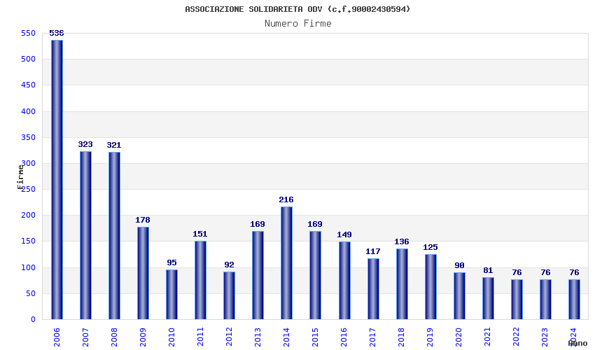 | Anno | Firme | Importi | Media | Naz. | Reg. | Prov. | Comu. |