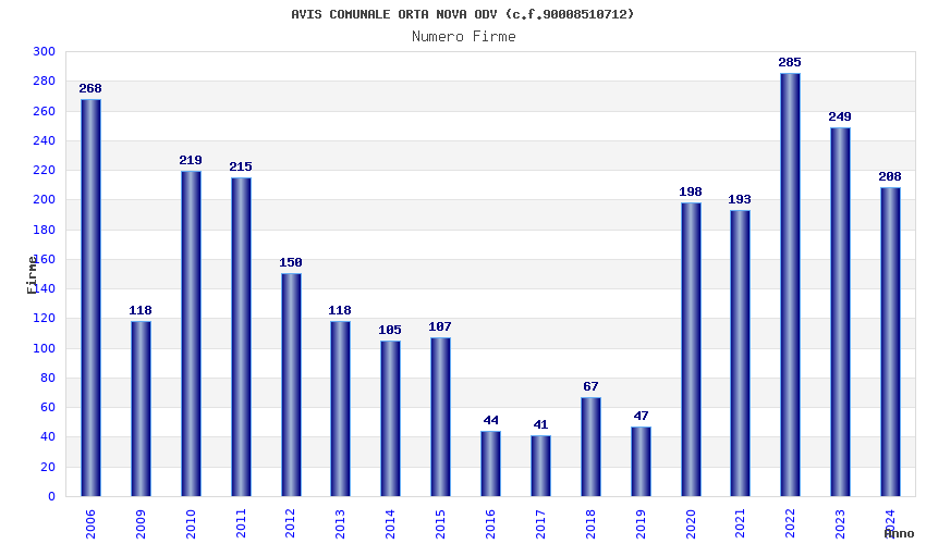 | Anno | Firme | Importi | Media | Naz. | Reg. | Prov. | Comu. |