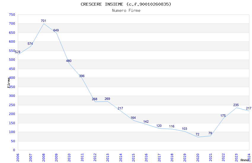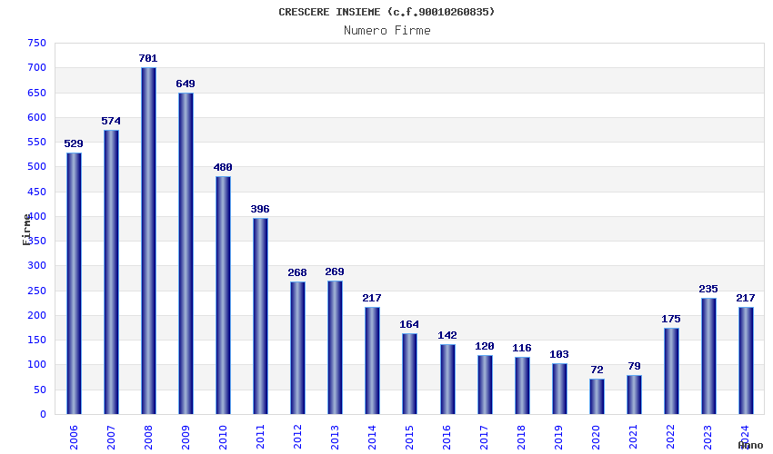 | Anno | Firme | Importi | Media | Naz. | Reg. | Prov. | Comu. |