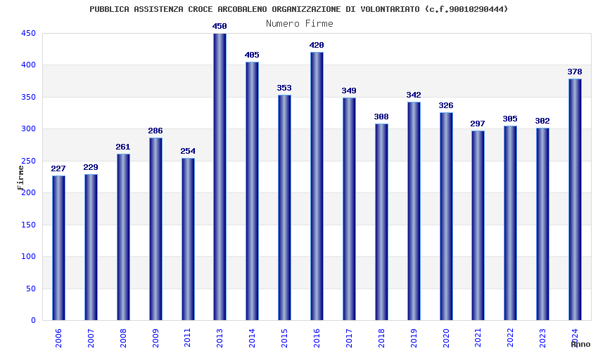 | Anno | Firme | Importi | Media | Naz. | Reg. | Prov. | Comu. |