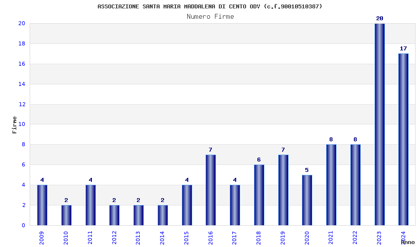 | Anno | Firme | Importi | Media | Naz. | Reg. | Prov. | Comu. |