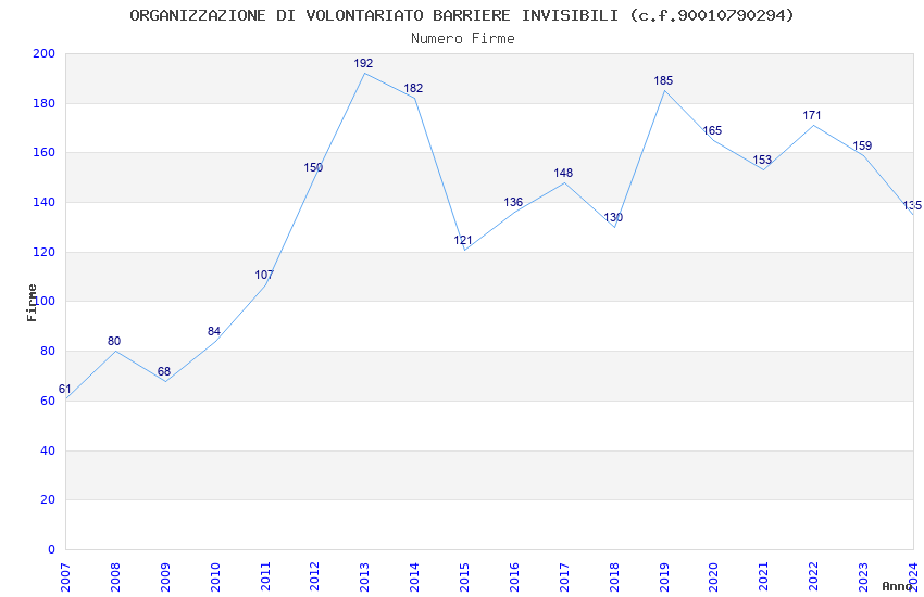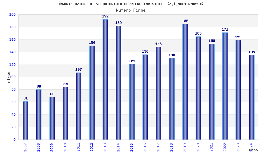 | Anno | Firme | Importi | Media | Naz. | Reg. | Prov. | Comu. |