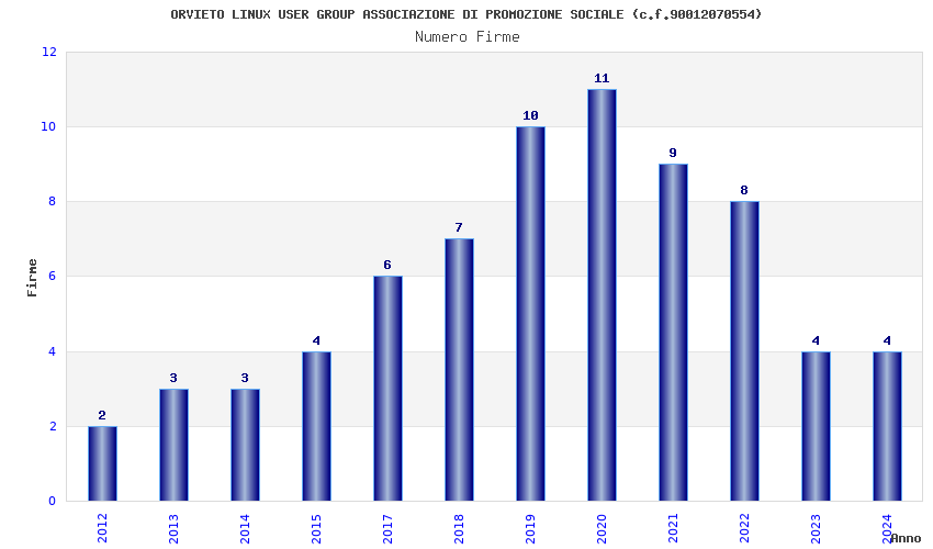 | Anno | Firme | Importi | Media | Naz. | Reg. | Prov. | Comu. |
