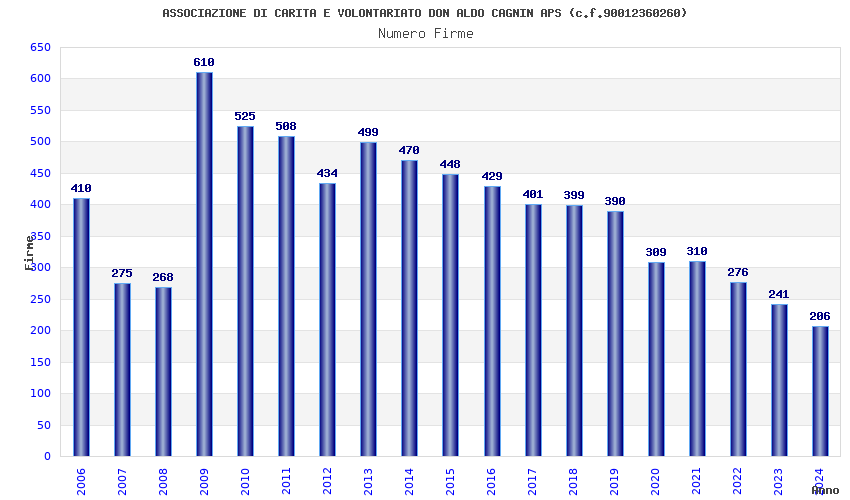 | Anno | Firme | Importi | Media | Naz. | Reg. | Prov. | Comu. |