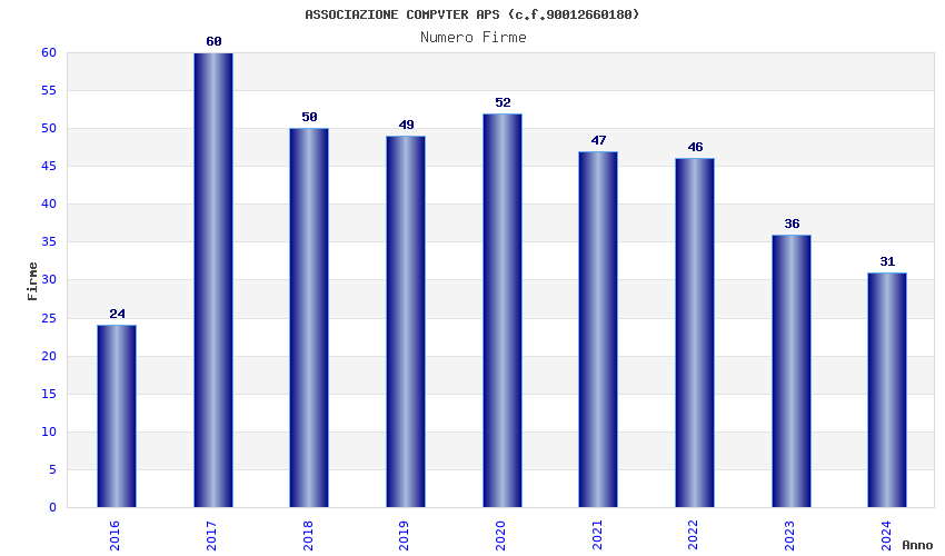 | Anno | Firme | Importi | Media | Naz. | Reg. | Prov. | Comu. |