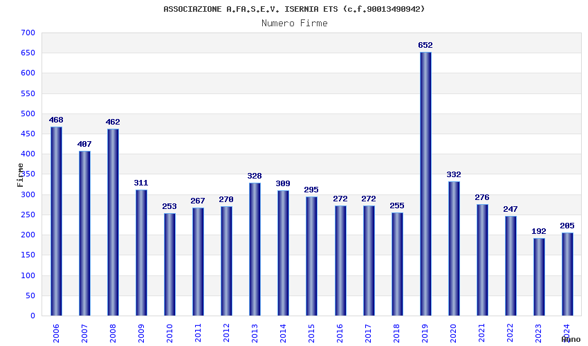 | Anno | Firme | Importi | Media | Naz. | Reg. | Prov. | Comu. |