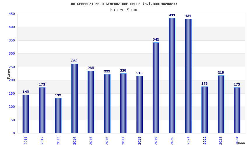| Anno | Firme | Importi | Media | Naz. | Reg. | Prov. | Comu. |