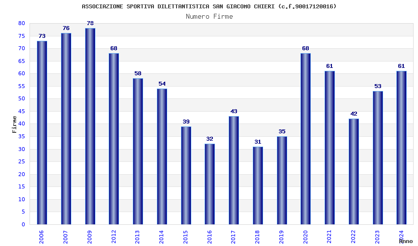 | Anno | Firme | Importi | Media | Naz. | Reg. | Prov. | Comu. |