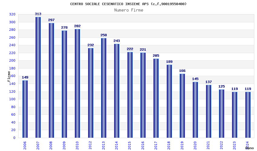 | Anno | Firme | Importi | Media | Naz. | Reg. | Prov. | Comu. |