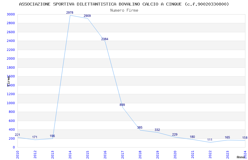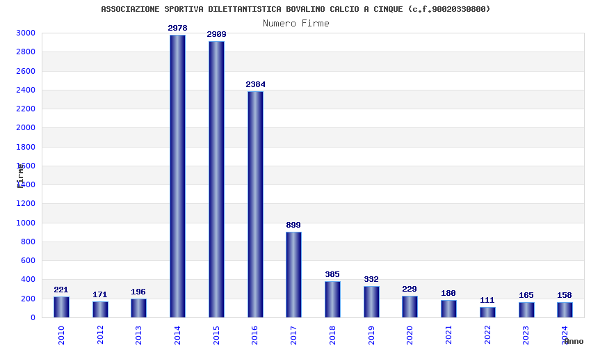 | Anno | Firme | Importi | Media | Naz. | Reg. | Prov. | Comu. |