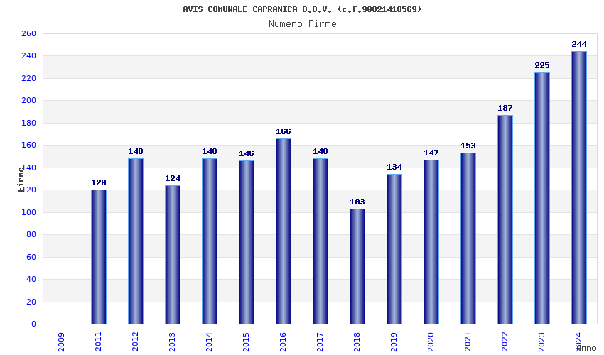 | Anno | Firme | Importi | Media | Naz. | Reg. | Prov. | Comu. |