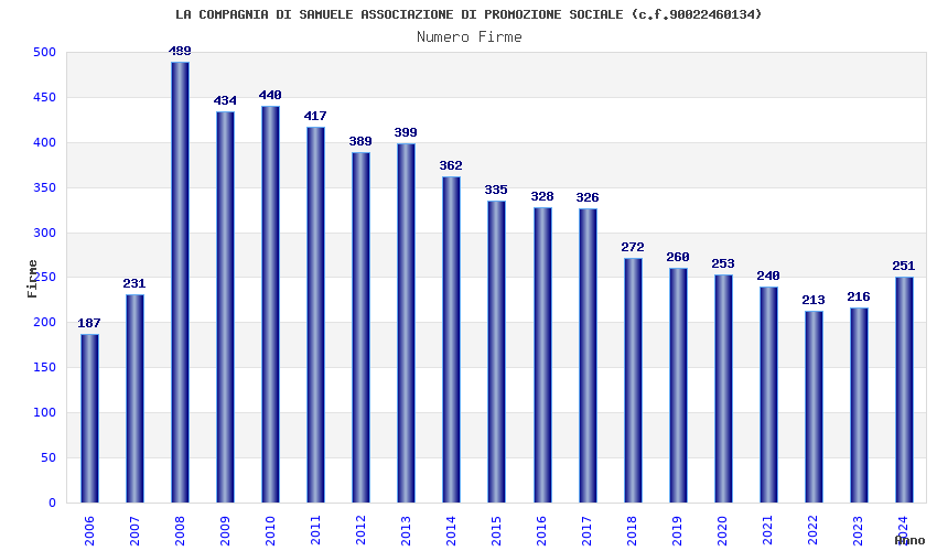| Anno | Firme | Importi | Media | Naz. | Reg. | Prov. | Comu. |