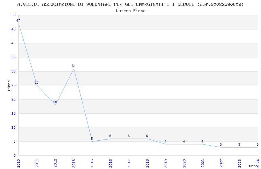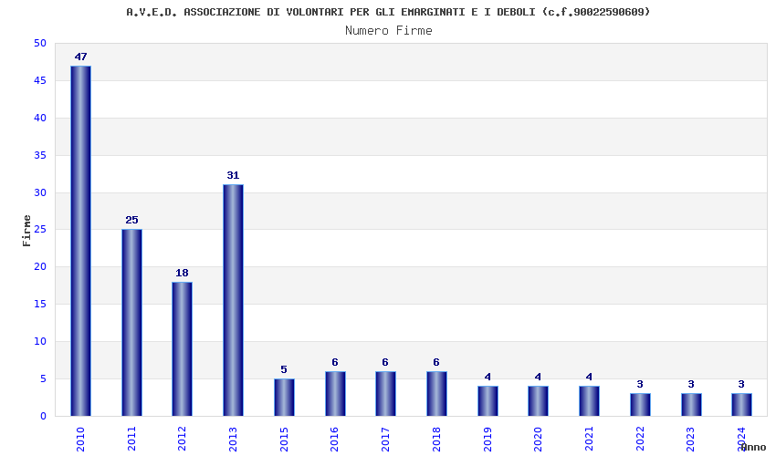| Anno | Firme | Importi | Media | Naz. | Reg. | Prov. | Comu. |