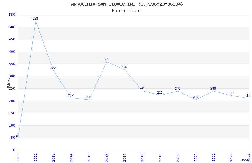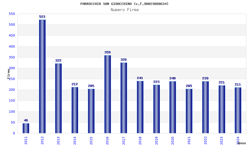 | Anno | Firme | Importi | Media | Naz. | Reg. | Prov. | Comu. |