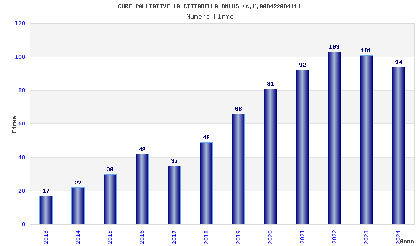 | Anno | Firme | Importi | Media | Naz. | Reg. | Prov. | Comu. |