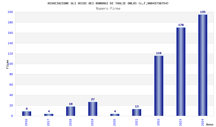 | Anno | Firme | Importi | Media | Naz. | Reg. | Prov. | Comu. |