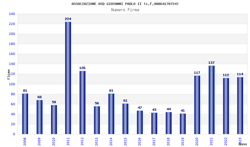 | Anno | Firme | Importi | Media | Naz. | Reg. | Prov. | Comu. |
