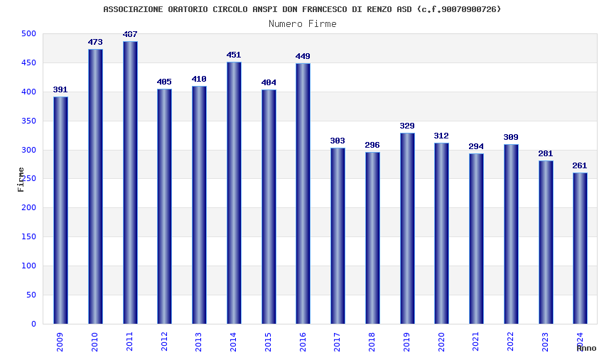 | Anno | Firme | Importi | Media | Naz. | Reg. | Prov. | Comu. |