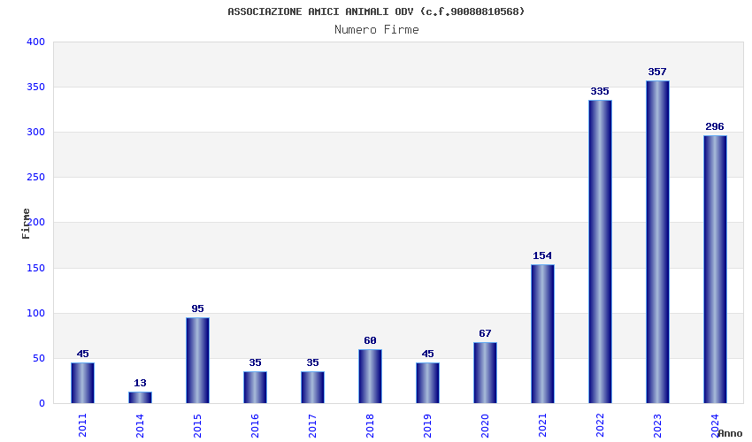 | Anno | Firme | Importi | Media | Naz. | Reg. | Prov. | Comu. |