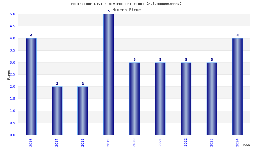 | Anno | Firme | Importi | Media | Naz. | Reg. | Prov. | Comu. |