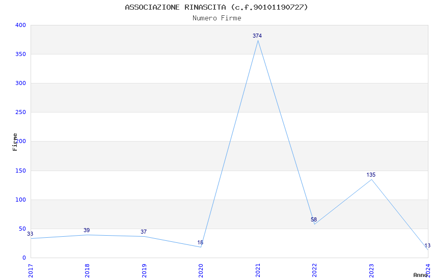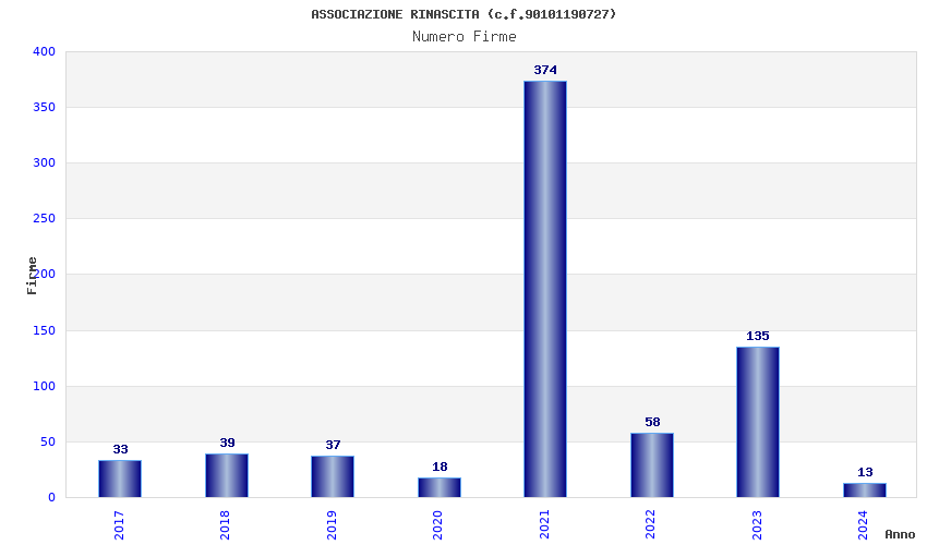 | Anno | Firme | Importi | Media | Naz. | Reg. | Prov. | Comu. |