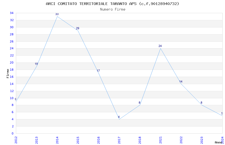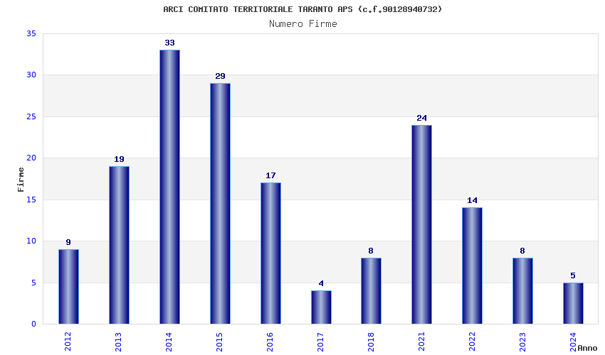 | Anno | Firme | Importi | Media | Naz. | Reg. | Prov. | Comu. |