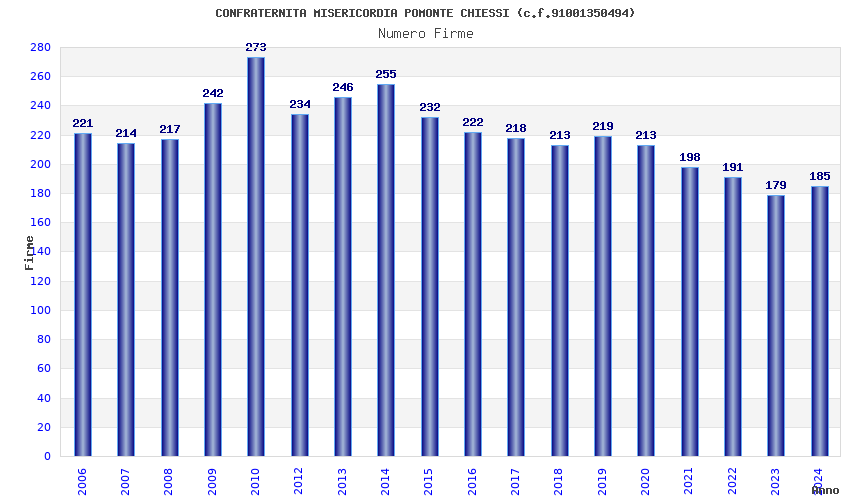 | Anno | Firme | Importi | Media | Naz. | Reg. | Prov. | Comu. |
