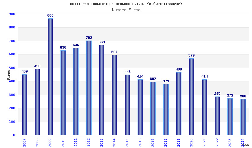 | Anno | Firme | Importi | Media | Naz. | Reg. | Prov. | Comu. |