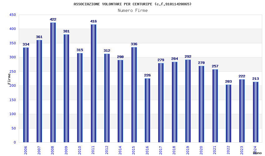 | Anno | Firme | Importi | Media | Naz. | Reg. | Prov. | Comu. |