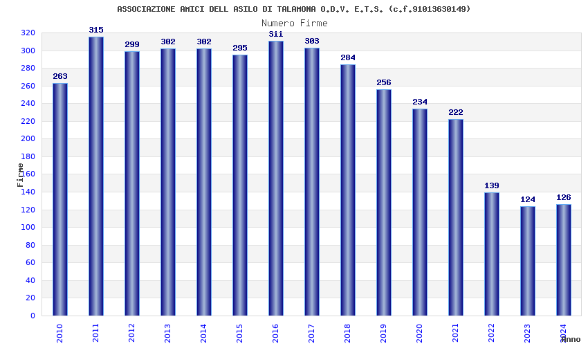 | Anno | Firme | Importi | Media | Naz. | Reg. | Prov. | Comu. |
