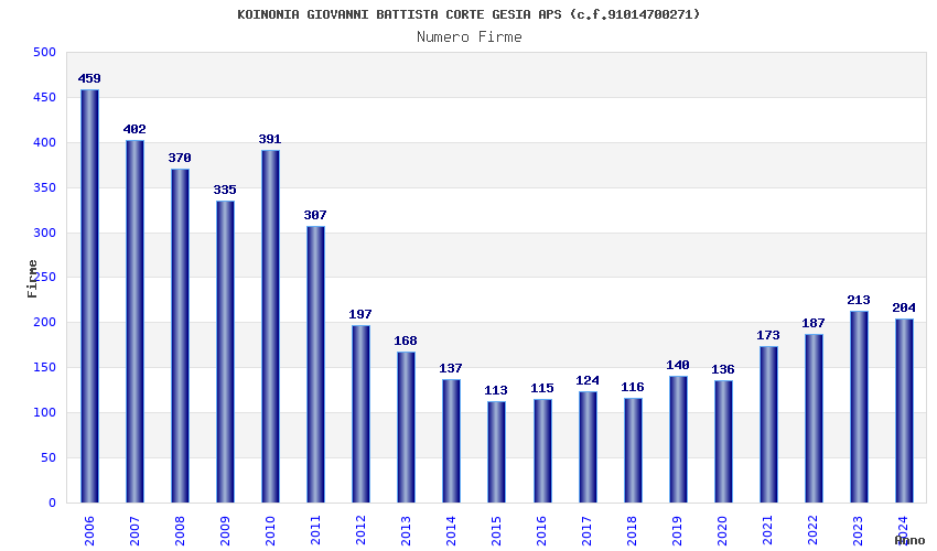 | Anno | Firme | Importi | Media | Naz. | Reg. | Prov. | Comu. |