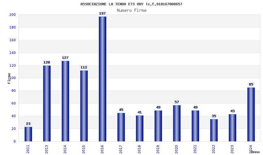 | Anno | Firme | Importi | Media | Naz. | Reg. | Prov. | Comu. |