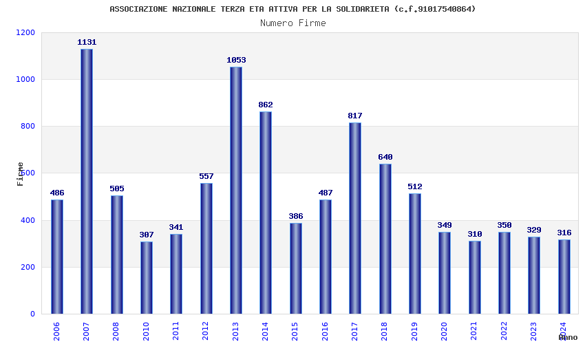 | Anno | Firme | Importi | Media | Naz. | Reg. | Prov. | Comu. |