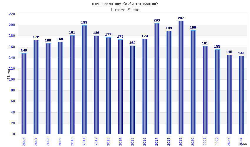 | Anno | Firme | Importi | Media | Naz. | Reg. | Prov. | Comu. |