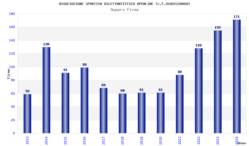 | Anno | Firme | Importi | Media | Naz. | Reg. | Prov. | Comu. |