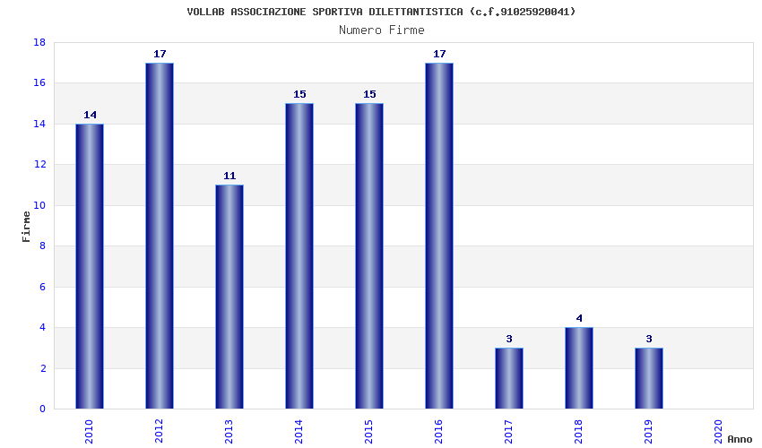 | Anno | Firme | Importi | Media | Naz. | Reg. | Prov. | Comu. |
