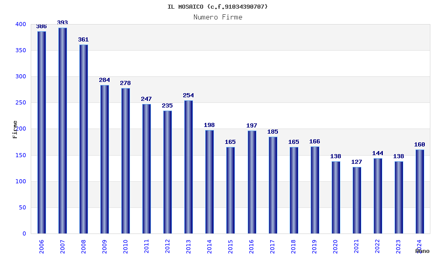 | Anno | Firme | Importi | Media | Naz. | Reg. | Prov. | Comu. |