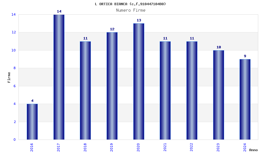 | Anno | Firme | Importi | Media | Naz. | Reg. | Prov. | Comu. |
