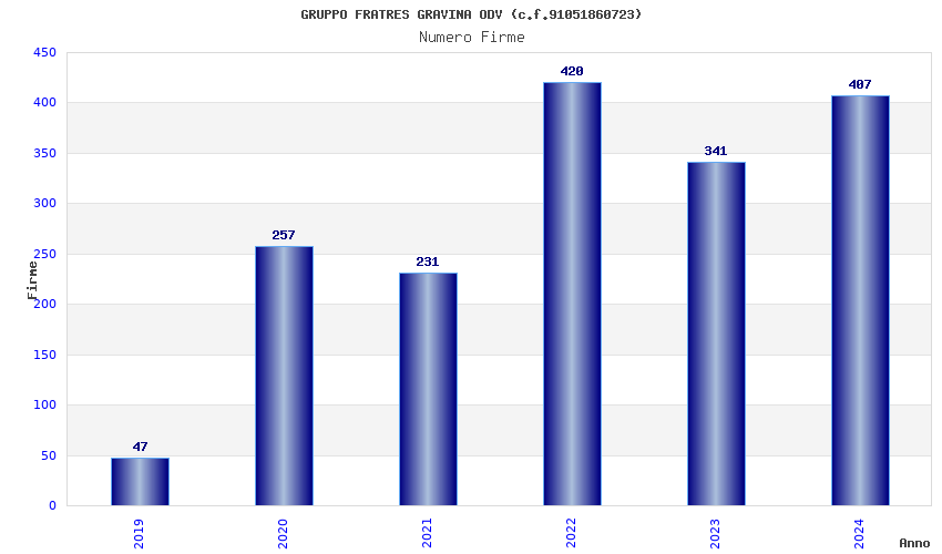 | Anno | Firme | Importi | Media | Naz. | Reg. | Prov. | Comu. |