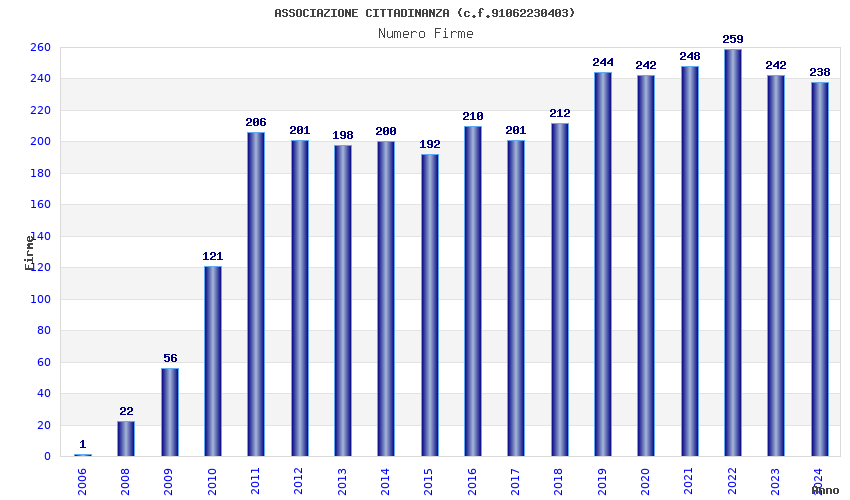 | Anno | Firme | Importi | Media | Naz. | Reg. | Prov. | Comu. |