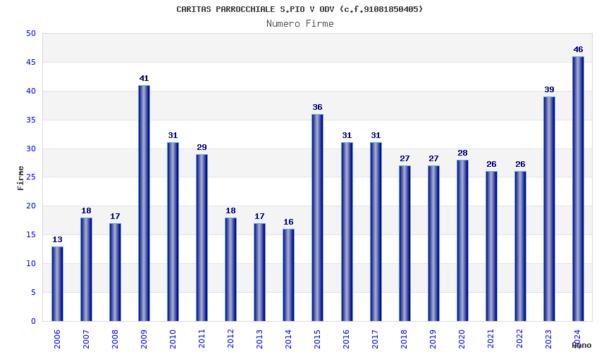 | Anno | Firme | Importi | Media | Naz. | Reg. | Prov. | Comu. |