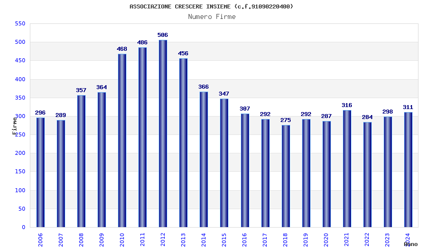 | Anno | Firme | Importi | Media | Naz. | Reg. | Prov. | Comu. |