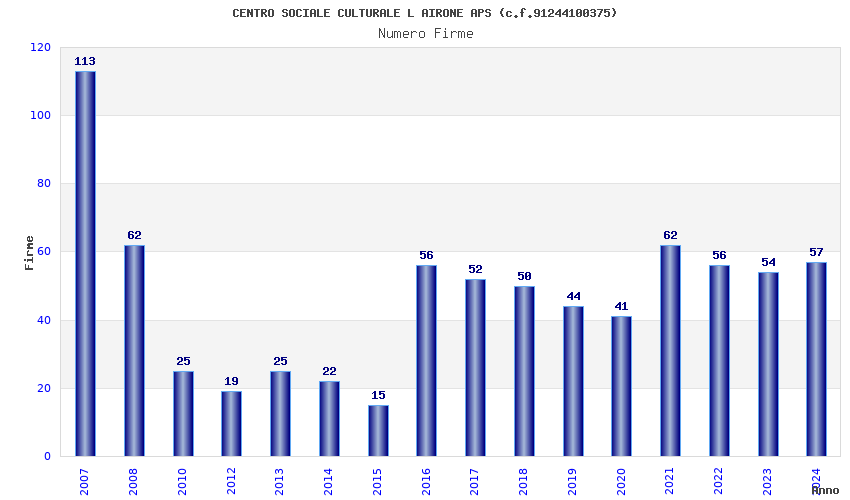 | Anno | Firme | Importi | Media | Naz. | Reg. | Prov. | Comu. |