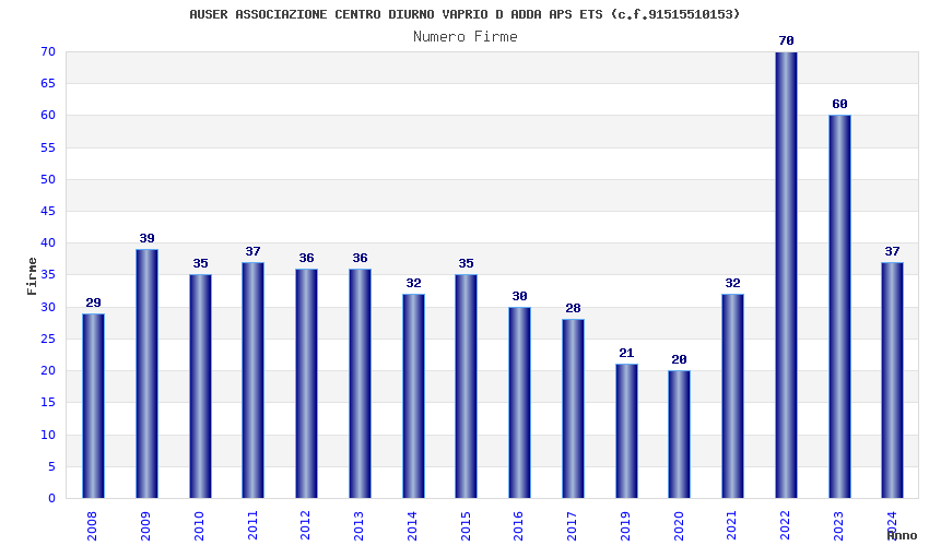 | Anno | Firme | Importi | Media | Naz. | Reg. | Prov. | Comu. |