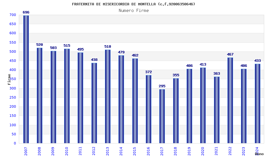 | Anno | Firme | Importi | Media | Naz. | Reg. | Prov. | Comu. |